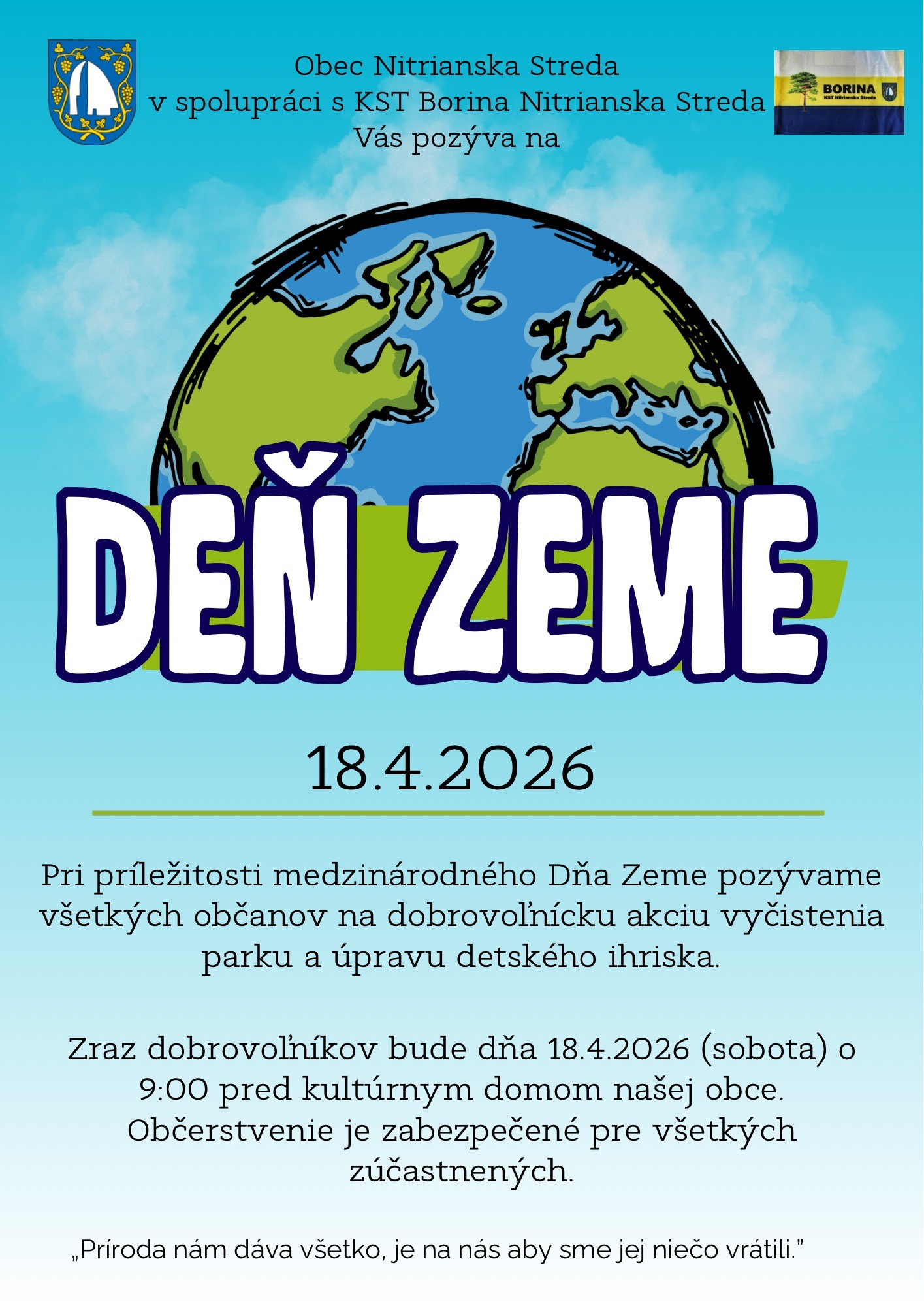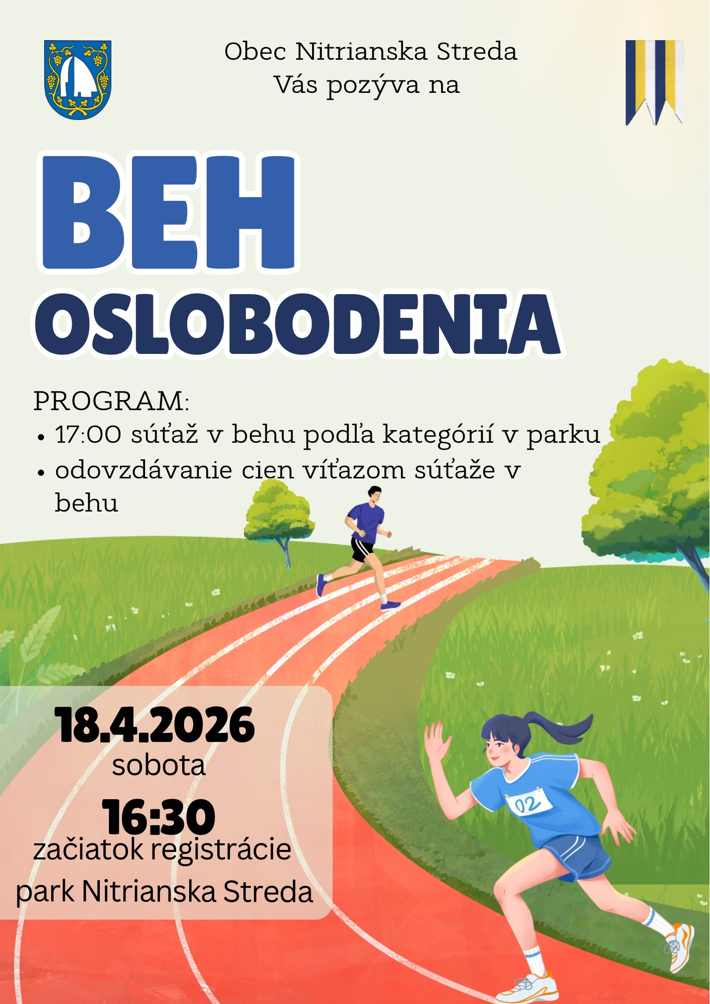 v sobotu 18. 04. 2026 od 9.00 hod. pri príležitosti medzinárodného Dňa Zeme pozývame všetkých občanov na dobrovoľnícku akciu vyčistenia parku a úpravu detského ihriska. Popoludní od 17.00 hod. radi privítame v parku všetkých malých aj veľkých na BEHU OSLOBODENIA. Začiatok registrácie je od 16.30 hod. v parku Nitrianska Streda.