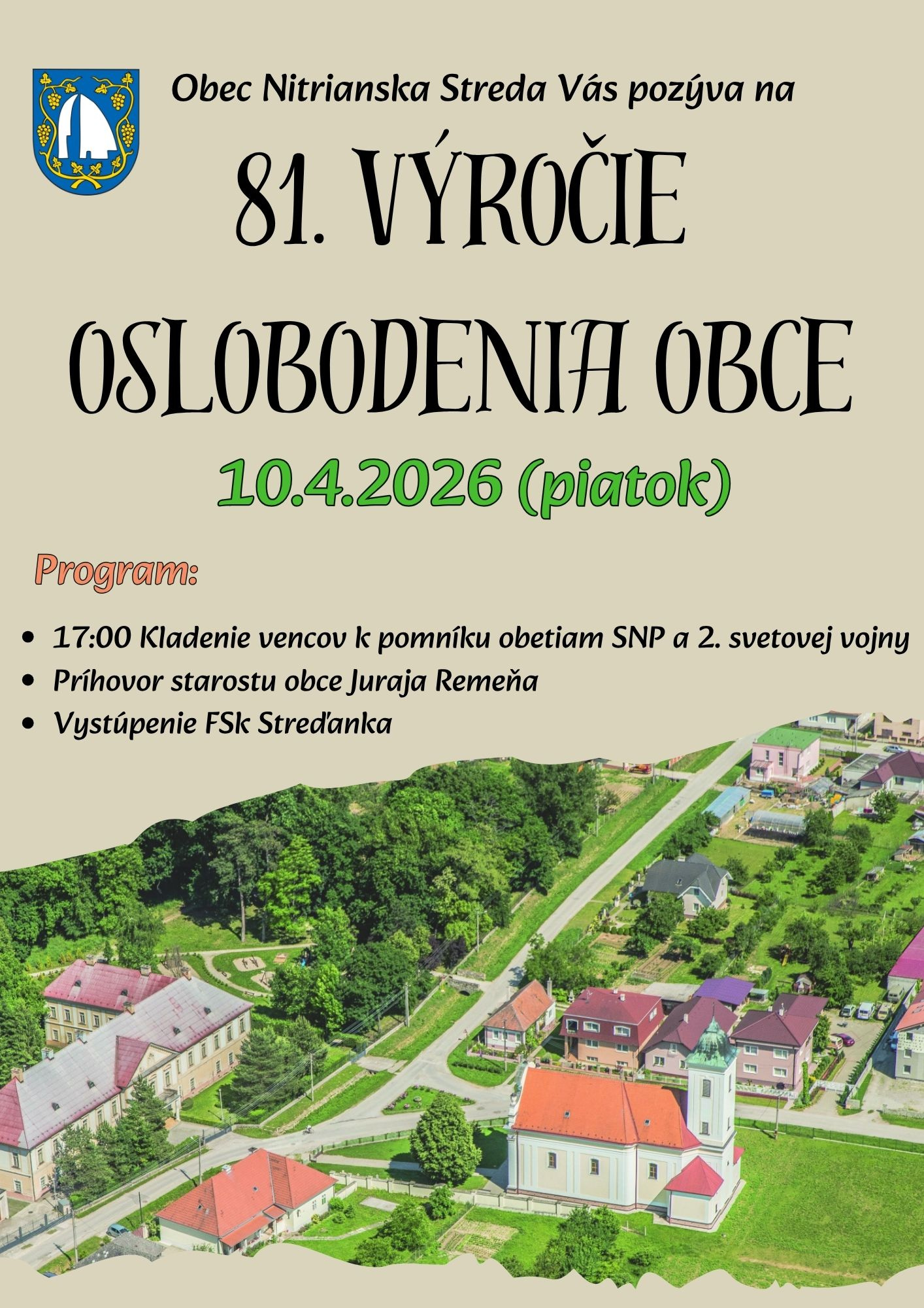 obec Nitrianska Streda Vás pri 81. výročí oslobodenia obce pozýva 10. 04. 2026 o 17.00 hod. k pietnemu aktu kladenia vencov k pomníku obetam SNP a 2. svetovej vojny.