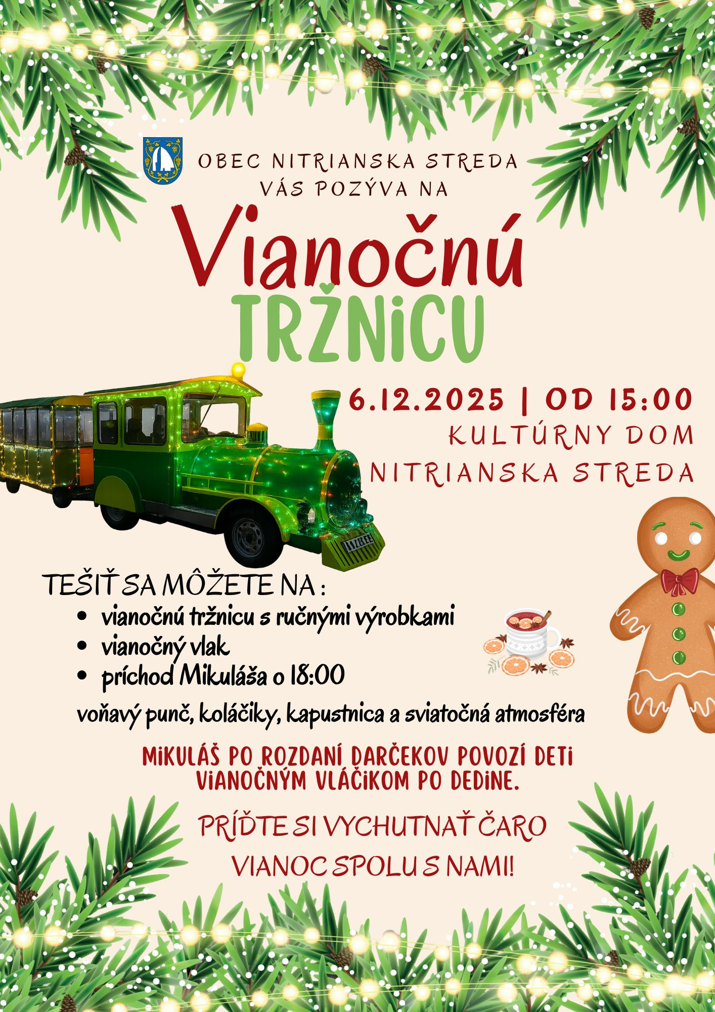 obec Nitrianska Streda Vás pozýva na "VIANOČNÚ TRŽNICU" dňa 6.12.2025 od 15.00 hod. v Kultúrnom dome Nitrianska Streda.